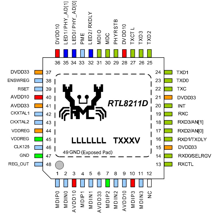 下图为RTL8211D 48-pin QFN封装的管脚图: